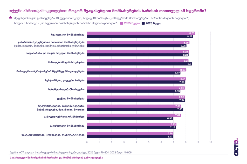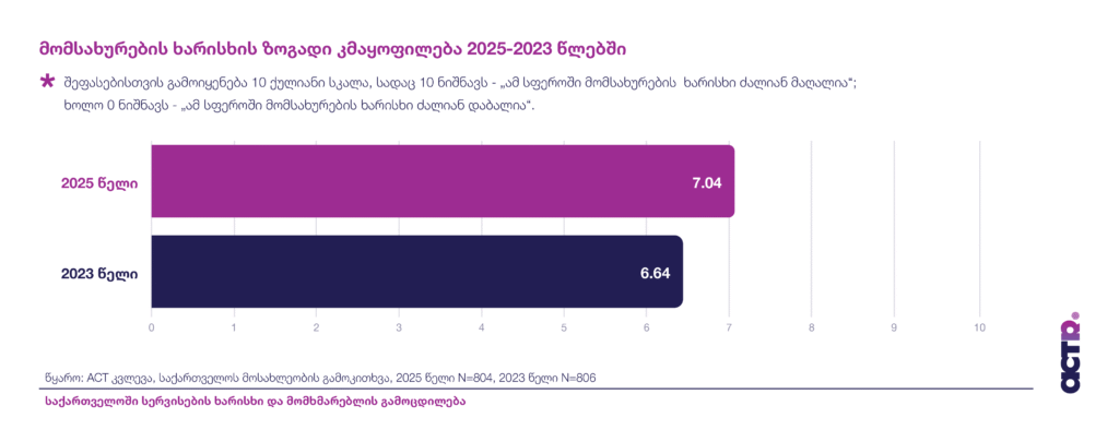 „ეისითი კვლევის“ (ACTR) მიერ ჩატარებული საზოგადოებრივი აზრის კვლევის – „საქართველოში სერვისების ხარისხი და მომხმარებლის გამოცდილება“ – მიხედვით, საქართველოს მოსახლეობამ მომსახურების ხარისხი საშუალოზე მაღალი ქულით შეაფასა: 10-ბალიანი სკალით 7.04 ქულა, რაც 2023 წელთან შედარებით გაზრდილია 0.4 ქულით (2023: 6.64 ქულა).